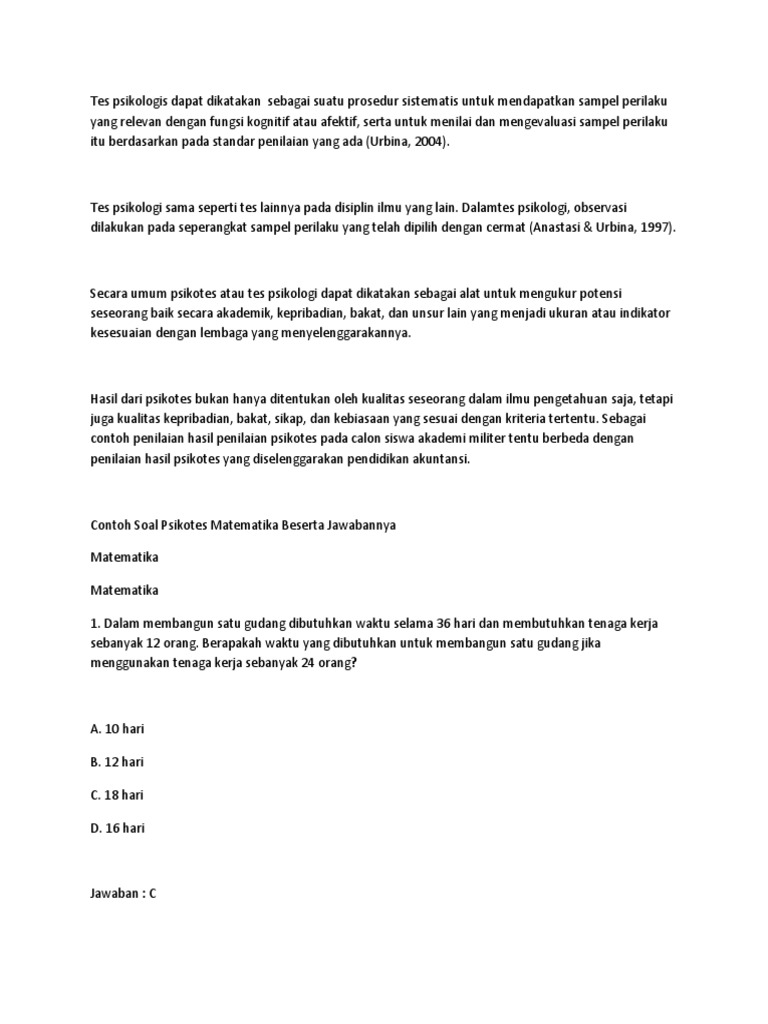 Ada beberapa macam dan pembagian dalam tahapan psikotes, diantaranya adalah : Jika anda sedang mencari materi soal psikotes sebagai panduan agar dapat lulus seleksi psikotes di. Ini contoh soal psikotes beserta jawaban dan tips mengerjakan. Contoh psikotes soal matematika dilengkapi pembahasan jawabannya. Contoh soal psikotes rumah sakit dan jawabannya pdf guru ilmu sosial. Contoh soal psikotes rumah sakit dan jawabannya dari sisi wawancara tersebut merupakan pengalaman yang pernah penulis dapatkan. Contoh soal psikotes daftar kerja, cpns dan tes masuk sekolah atau kuliah. Tes iq, tes kepribadian, test kemampuan, dan tes kreatifitas. #2 76 x 11 +11 = …. Satu lagi tes yang harus anda lakukan pada tahapan soal tes bahasa inggris masuk kerja yaitu tes psikotes. Melalui contoh soal psikotes ini, kamu bisa menghadapi ujian psikotes dengan amat percaya diri. Ibu mempunyai uang sebesar rp. Inilah pembahasan lengkap terkait contoh soal psikotes rumah sakit dan jawabannya.